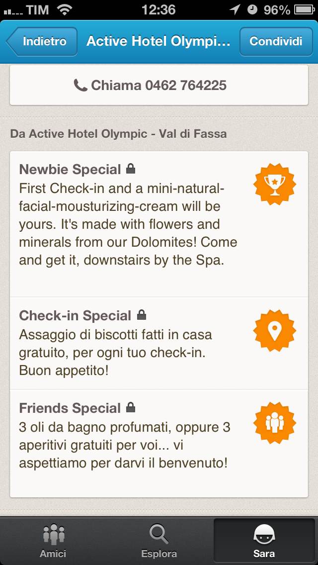 Arrivati all’Active Hotel Olympic facciamo check-in con Foursquare e iniziamo l’avventura sbloccando subito delle promozioni.